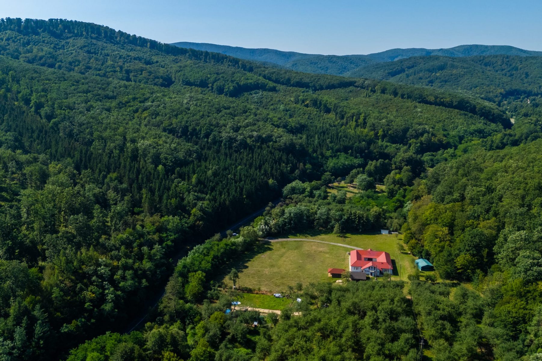 Pe un teren cu suprafata de 10.543 mp, cu acces direct din drumul asfaltat, flancat de parau si livada la intrate si padure in limita din spate a proprietatii, se afla cateva corpuri de cladiri care ofera multe posibilitati.