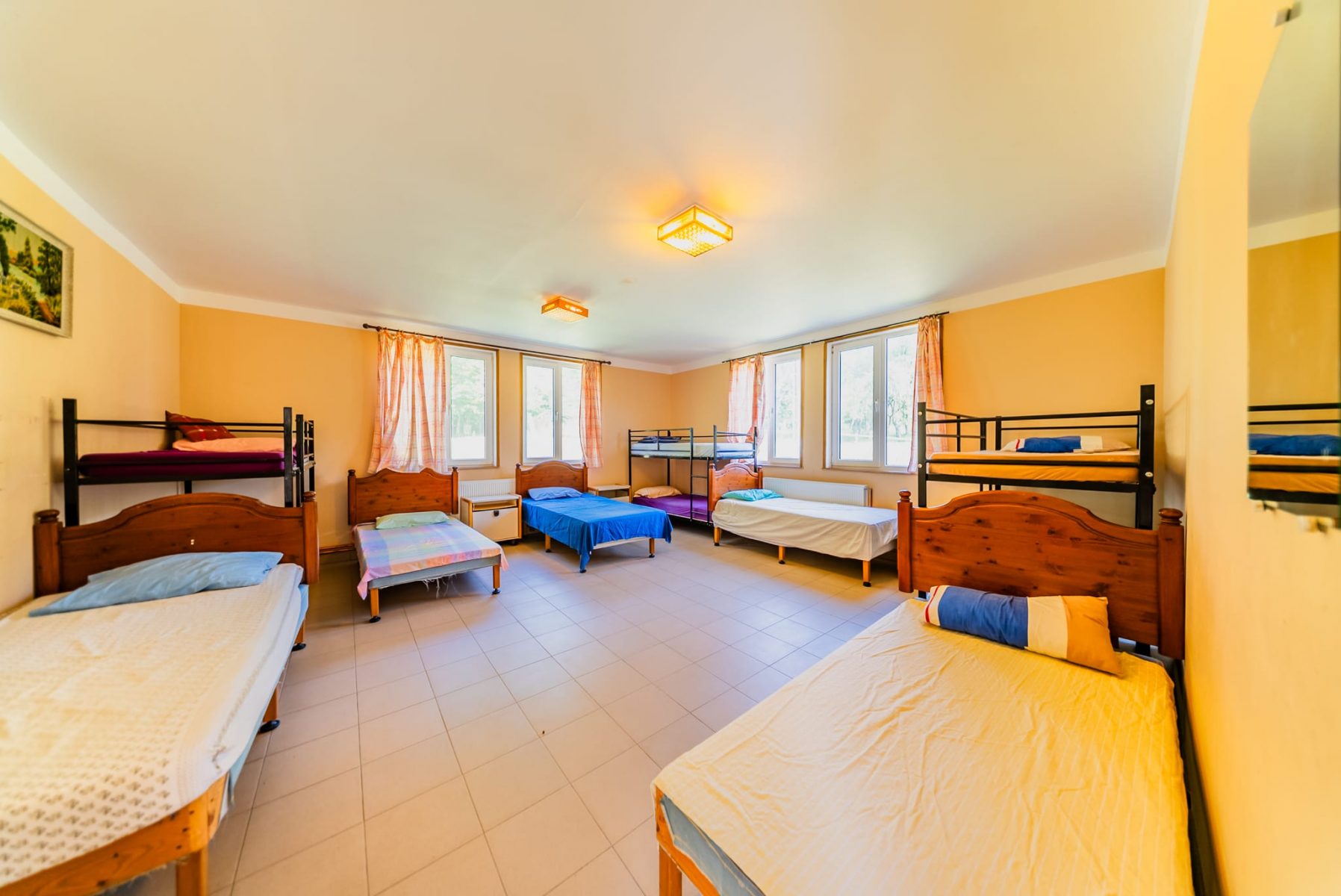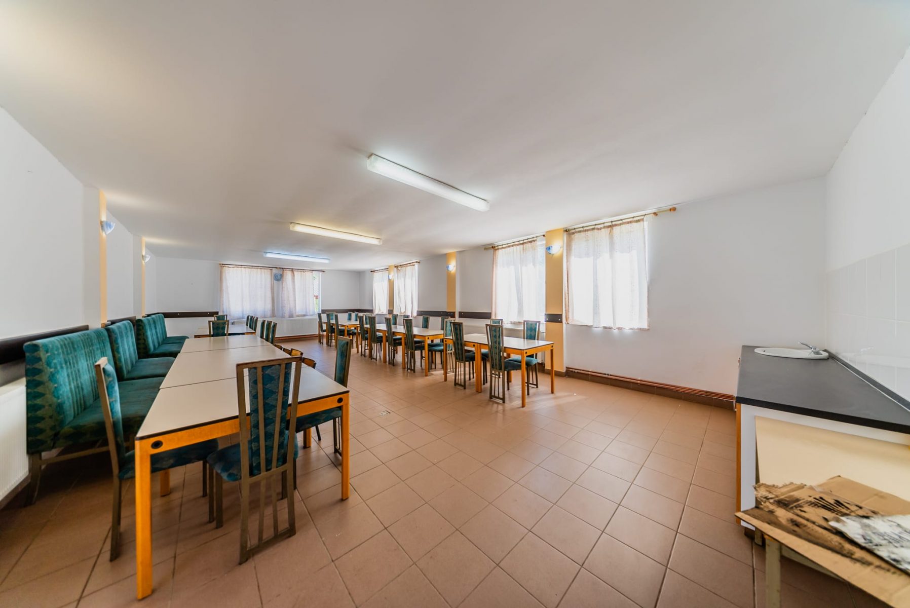 Datorita faptului ca a functionat ca si tabara privata pentru copii, cladirea are functionalitate bine gandita, avand 6 dormitoare dintre care 4 mari si 2 mai mici, avand o capacitate acum de 70 de locuri de cazare, dispune de dusuri separate fete si baieti, bai separate de asemenea, bucatarie, zona depozitare alimente, sala de mese de aproape 100 de locuri, zona de birou, mansarda fiind nefinisata, lasand posibiltatea extinderii si la etaj. Cladirea are geamuri si usi termopan, este constructie noua, instalatie electrica, curent stabil (in curtea imobilului existand transformator medie tensiune).